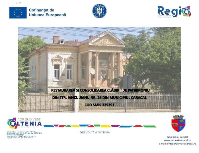 U.A.T. MUNICIPIUL CARACAL, în calitate de beneficiar conform contractului de finanțare nr. 609/23.06.2025, anunță lansarea proiectului „Restaurarea și consolidarea clădirii de patrimoniu din str. Iancu Jianu nr. 26 din Municipiul Caracal” depus în cadrul Programului Regional Sud – Vest Oltenia 2021 – 2027, Prioritatea: 7 – Dezvoltare teritorială sustenabilă, Obiectiv specific 5.1 – Promovarea dezvoltării integrate și incluzive în domeniul social, economic și al mediului, precum și a culturii, a patrimoniului natural, a turismului durabil și a securității în zonele urbane.